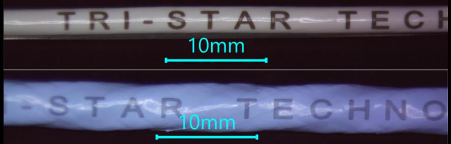 Fig.2 shows ETFE, and PTFE insulated wires processed with Tri-Star Technologies M-100L-FG wire marking system. Well defined, legible prints stay intact even after extensive accelerated thermal aging.